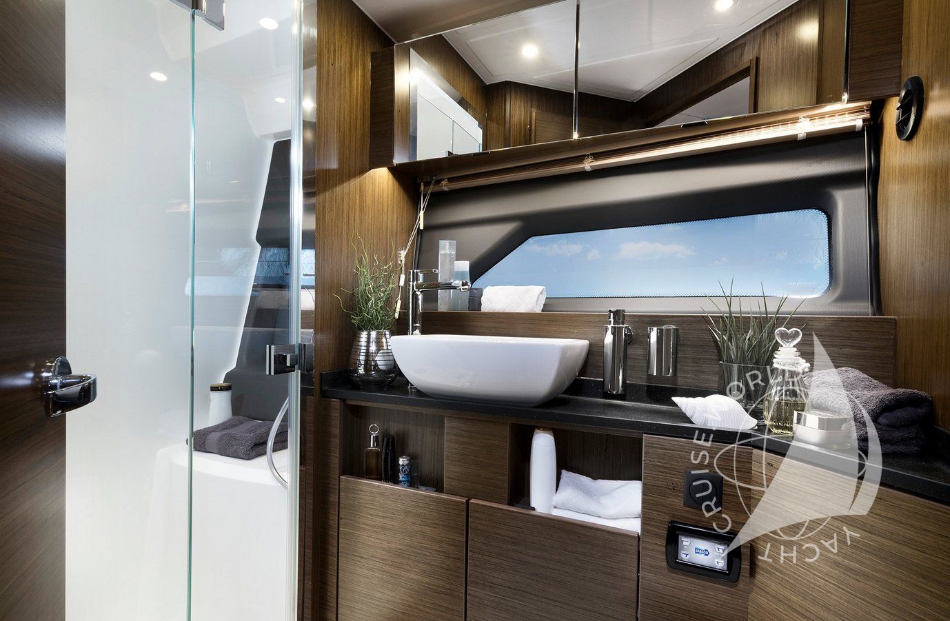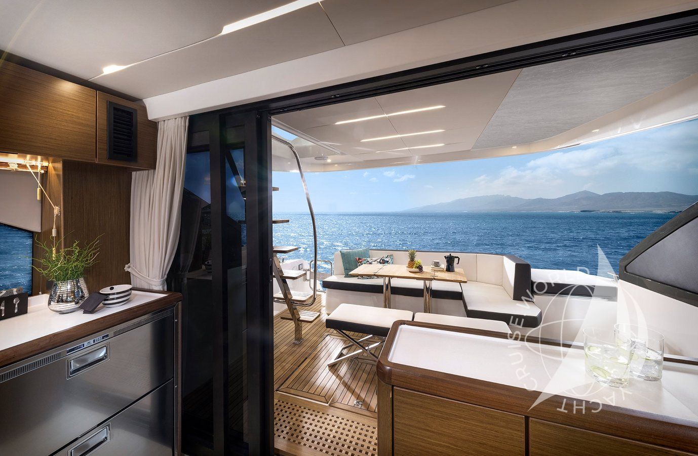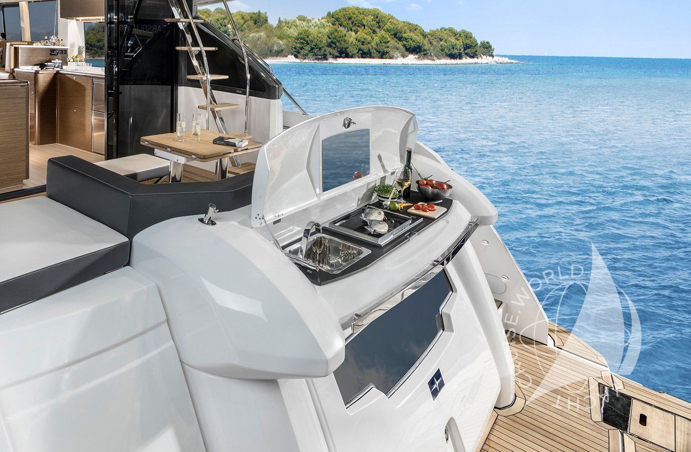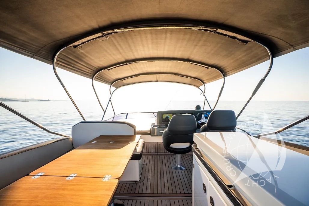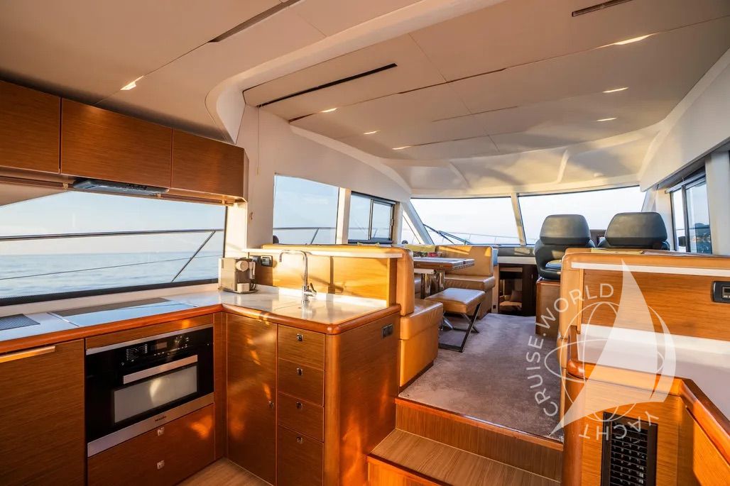 - Flybridge with wet bar with electric BBQ, sink, and fridge