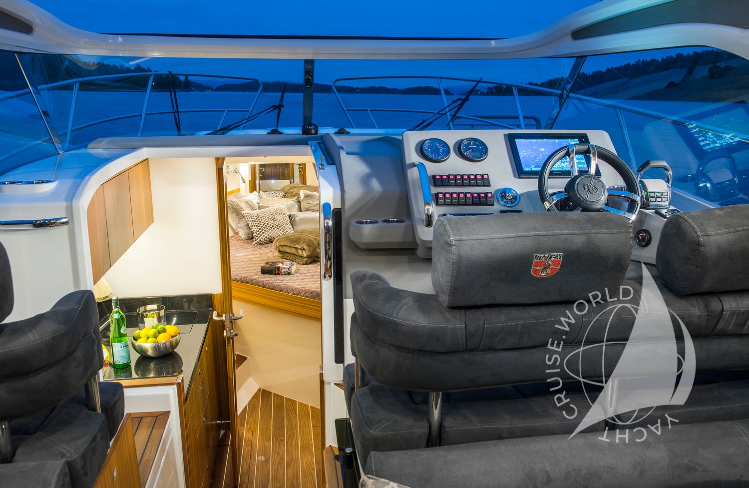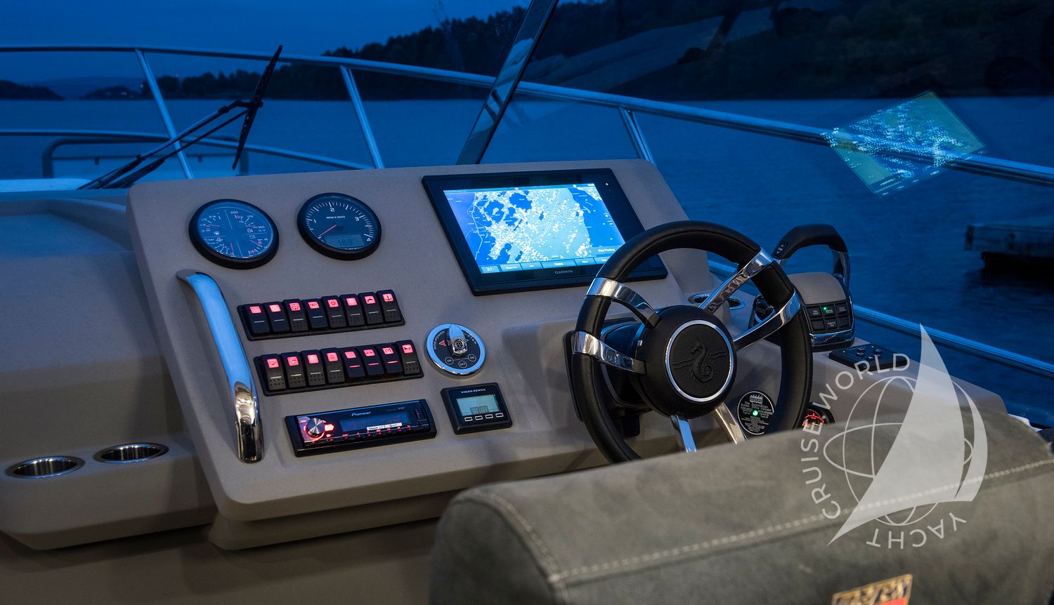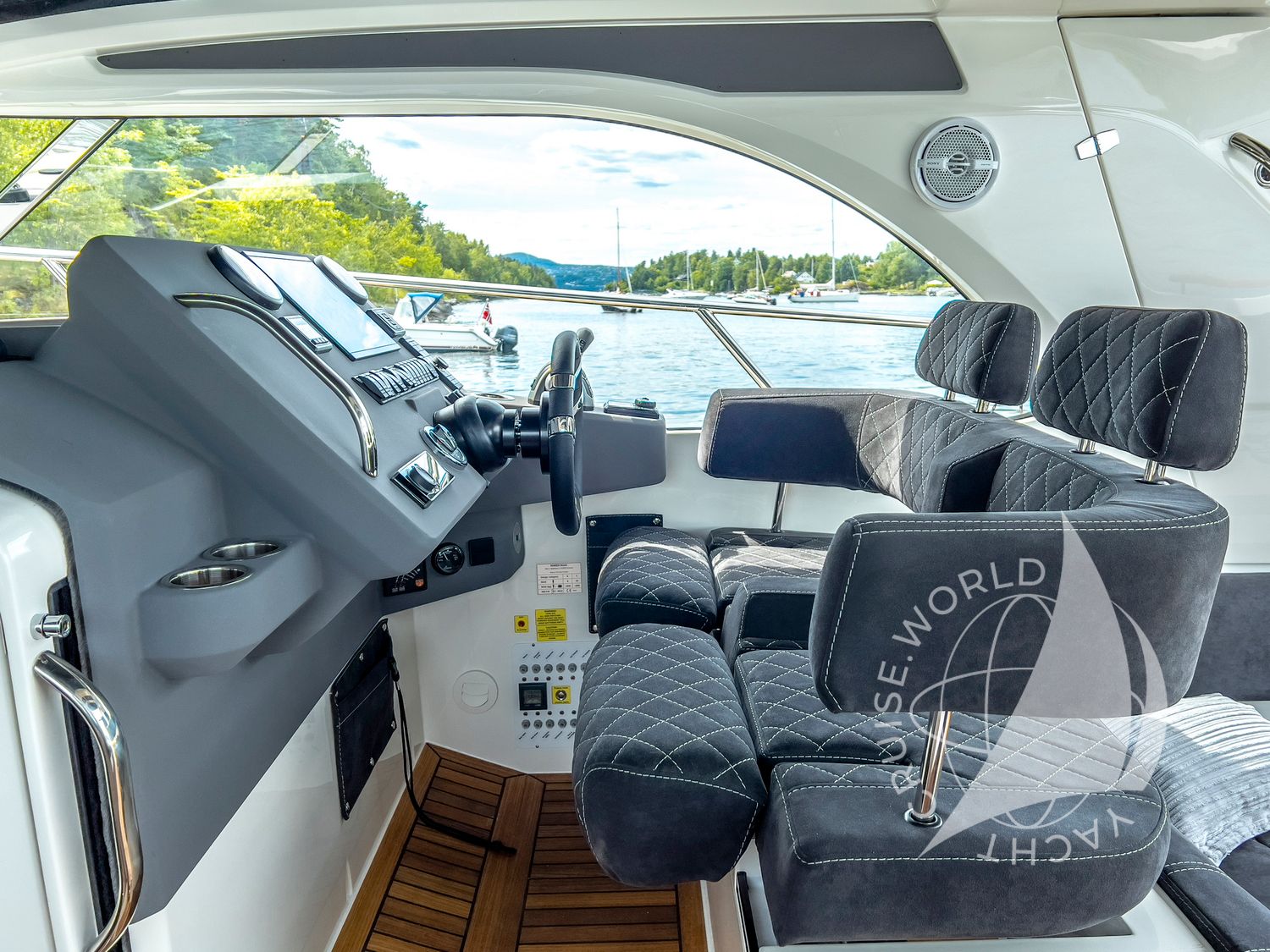 - Ergonomic helm station with large chartplotter